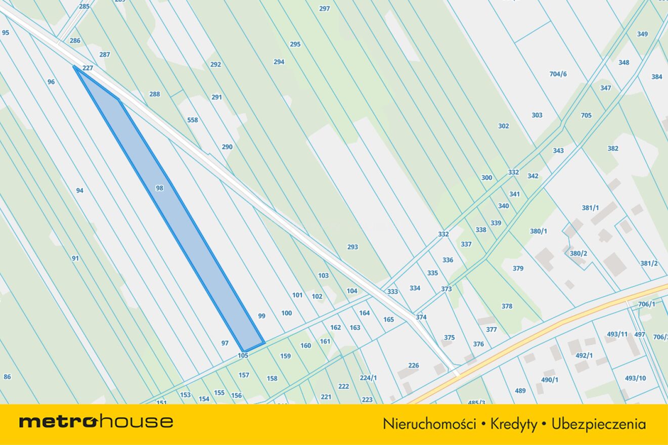 Działka nr 98 (6335 m²) rozległy teren położony po drugiej stronie drogi asfaltowej, idealny pod uprawy, sad, rekreację, wypoczynek na łonie natury.